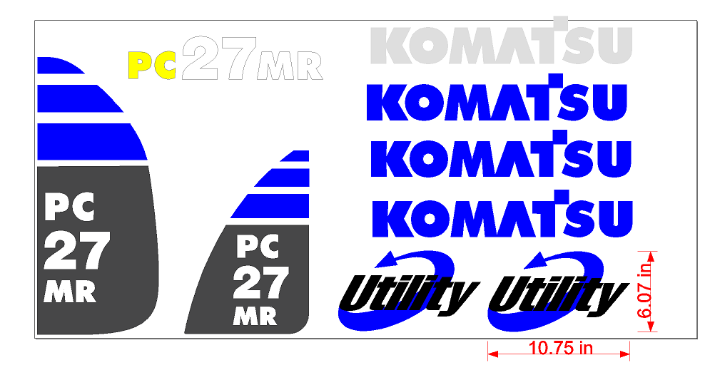 Best Price on Komatsu PC27MR-3 Decals, Fast Shipment, even with customization. Decals are of OEM quality at the best price and ship within 24 hours.